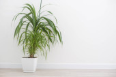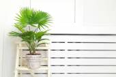Garnek z zieloną rośliną na schodach na drewnianej podłodze w pokoju.