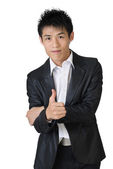azjatycki biznesmen siedzieć i daje doskonały sygnał