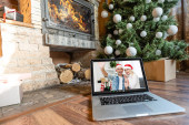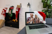 para macha podczas wideokonferencji w kapeluszach Mikołaja na laptopie w domu. oddalenie społeczne podczas świątecznej kwarantanny koncepcja zamknięcia.