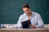 Zdjęcie "Młody nauczyciel przed zieloną tablicą" może być wykorzystywane do celów osobistych i komercyjnych zgodnie z warunkami zakupionej licencji Royalty-free. Obraz jest dostępny do pobrania w jakości wysokiej rozdzielczości do 5760x3840.