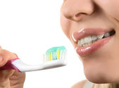 kobieta zbliżenie zdrowy ząb ze szczoteczka do zębów na czarnym tle