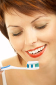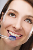 kobieta zbliżenie zdrowy ząb ze szczoteczka do zębów na czarnym tle