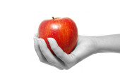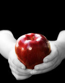 strony kobieta podając jabłka człowiekowi na czarnym tle