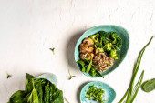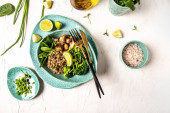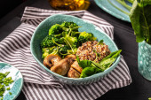 Świeża wegańska sałatka warzywna ze świeżego szpinaku, grzybów, brokułów i komosy, zdrowe wegetariańskie jedzenie.