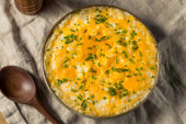 Naczynie do pieczenia z smaczną zapiekanką ryżową na stole