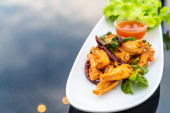 Zdjęcie "danie główne Głęboko smażone ostrygi w sałacie Cup serwowane w białej porcelany porcelany miski" może być wykorzystywane do celów osobistych i komercyjnych zgodnie z warunkami zakupionej licencji Royalty-free. Obraz jest dostępny do pobrania w jakości wysokiej rozdzielczości do 5760x3840.
