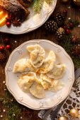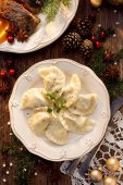 Zamknij widok pierogi świąteczne z wegetariańskim farszu na białym talerzu. Tradycyjne danie wigilijne