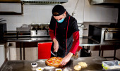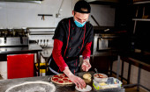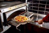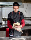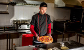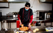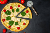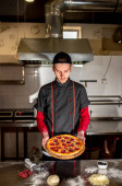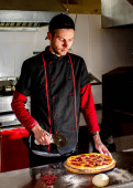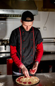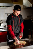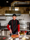 widok szefa kuchni cięcia świeżej pizzy w kuchni, koncepcja gotowania