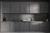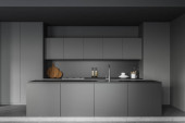 Zdjęcie "Blisko stylowej kuchni z ciemnoszarymi ścianami, betonową podłogą, szarymi szafkami i wyspą. 3d renderowanie" może być wykorzystywane do celów osobistych i komercyjnych zgodnie z warunkami zakupionej licencji Royalty-free. Obraz jest dostępny do pobrania w jakości wysokiej rozdzielczości do 5760x3840.