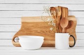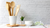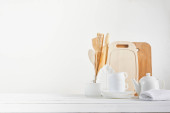 Puste miejsce na koncepcję kuchennego banera. Tło kuchenne do makiety z łyżeczką, czajniczek, kubki, wałek, miski na drewnianym stole, białe tło.