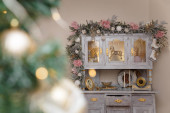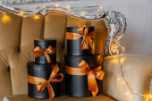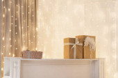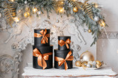 Zdjęcie "Zapakowane Wesołych Świąt i złote błyszczące renifery, zimowe zabawki ptaka na białym fortepianie. Złota girlanda światła bokeh, błyszczące elementy dekoracyjne. Koncepcja ferii zimowych." może być wykorzystywane do celów osobistych i komercyjnych zgodnie z warunkami zakupionej licencji Royalty-free. Obraz jest dostępny do pobrania w jakości wysokiej rozdzielczości do 5760x3840.