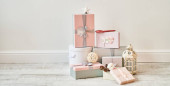 Zapakowane Wesołych Świąt i złote błyszczące renifery, zimowe zabawki ptaka na białym fortepianie. Złota girlanda światła bokeh, błyszczące elementy dekoracyjne. Koncepcja ferii zimowych.