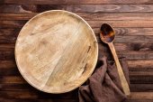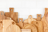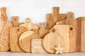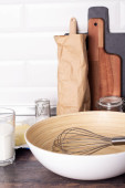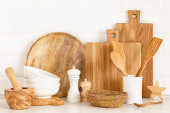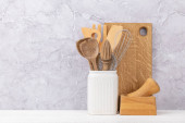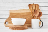 Przybory kuchenne na blat, tło kulinarne, ceramika drewniana i biała, koncepcja gotowania domowego