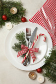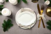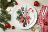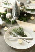 Koncepcja romantycznego nakrycia stołu noworocznego na szarym stole