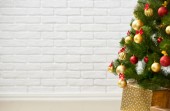 Złote i czerwone zabawki świąteczne, kulki, girlandy na gałązce świerku na ciemnoczerwonym tle.