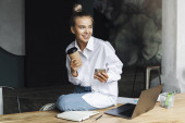 Millenijna kobieta komunikuje się z przyjaciółmi, klientami korzystającymi z portali społecznościowych. Biznes kobieta pracuje z domu biura