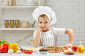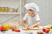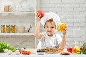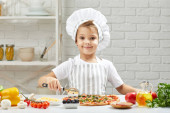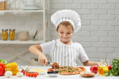 mały chłopiec w kapeluszu szefa kuchni i fartuch gotowanie pizzy