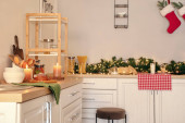 Zbliżenie wnętrza kuchni. Świąteczne dekoracje. Adwentowy wieniec wiszący na szynach. Ściana z białej cegły, płytki metra, drewniane blaty z naczyniami kuchennymi. Vintage skandynawski design.