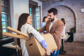 Zdjęcie "Młoda para niesie duże kartonowe pudełko w nowym domu.Przeprowadzka dom." może być wykorzystywane do celów osobistych i komercyjnych zgodnie z warunkami zakupionej licencji Royalty-free. Obraz jest dostępny do pobrania w jakości wysokiej rozdzielczości do 5760x3840.