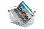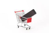 Smartfon wewnątrz koszyka zakupów, renderowanie 3D izolowane na białym tle