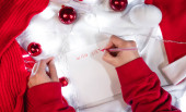 Napisz listę życzeń dla Mikołaja czerwonym długopisem na białym arkuszu. Czerwone świąteczne kulki, czapka Mikołaja i ręcznie robiony szalik. Napisz list z życzeniami na białym kocu.