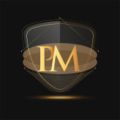 Początkowe logo PM nazwa firmy kolorowe niebiesko-białe swoosh projektu, izolowane na ciemnym tle. logo wektora dla firmy i tożsamości firmy.