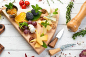 Zdjęcie "Różne sery na talerzu. Ser parmezan, ser błękitny i brie na talerzu z winogron i fig. Antypasto. Widok z góry." może być wykorzystywane do celów osobistych i komercyjnych zgodnie z warunkami zakupionej licencji Royalty-free. Obraz jest dostępny do pobrania w jakości wysokiej rozdzielczości do 5760x3840.