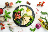 Różne sery na talerzu. Ser parmezan, ser błękitny i brie na talerzu z winogron i fig. Antypasto. Widok z góry.