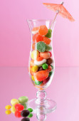 smaczne cukierki w kubek kwiaty na stole na jasnym tle