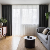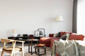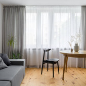 Proste wnętrze salonu z betonem na ścianie i suficie, drewniana podłoga z drewna sosnowego i drewniany stół z dwoma czarnymi krzesłami