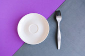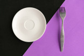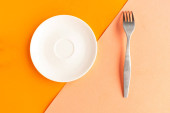 Pusty talerz i widelec na szarym i żółtym tle. Skopiuj miejsce na tekst. Koncepcja minimalna