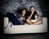 młode dziewczyny, oglądanie filmu grozy w domu Poczernianie-out