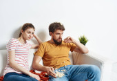 Mężczyzna z talerzami popcorn i kobieta na pomarańczowej kanapie znajomych rodziny zabawy