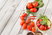 Świeże czerwone dojrzałe pomidory wiśniowe w drewnianej misce z liśćmi sałatki, cebulą, pieprzem, grzybami champignon, przyprawami i solą na lekkim tle żywności.