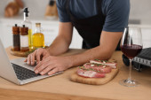 Przyjaciele pijący wino podczas komunikacji przez internetową konferencję wideo w kuchni. Odległość społeczna podczas pandemii koronawirusowej