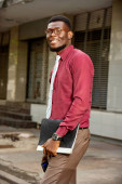 Portret młodego Afrykanina stojącego uśmiechniętego w czerwonym burgundowym aptece z czarnym zegarkiem i ramką.