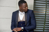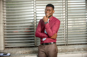 Portret młodego Afrykanina stojącego w refleksji w czerwonym burgundowym aptece, czarnym zegarku i okularach.