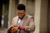 Przystojny afrykański biznesmen stojący w kasie, noszący czerwony burgundowy chemik, noszący zegarek na rączce i okulary