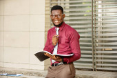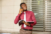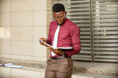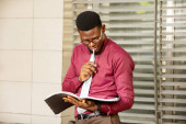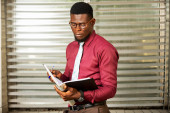 młody biznesmen, Afrykanin patrząc na swój dokument trzymając długopis i wiedzieć ramki noszenie czerwony burgundowy chemia