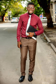 Zdjęcie "Afrykański biznesmen szuka dokumentów i wskazuje na białe tło. Udany biznesmen w czerwonej burgundowej bluzce" może być wykorzystywane do celów osobistych i komercyjnych zgodnie z warunkami zakupionej licencji Royalty-free. Obraz jest dostępny do pobrania w jakości wysokiej rozdzielczości do 5760x3840.