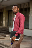 Afrykański biznesmen szuka dokumentów i wskazuje na białe tło. Udany biznesmen w czerwonej burgundowej bluzce