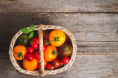 Zdjęcie "Dojrzałe żółto-czerwone pomidory na jasnoniebieskim drewnianym stole, płaska nioska" może być wykorzystywane do celów osobistych i komercyjnych zgodnie z warunkami zakupionej licencji Royalty-free. Obraz jest dostępny do pobrania w jakości wysokiej rozdzielczości do 5760x3840.