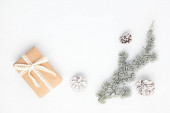 Hygge ekologiczny papier zapakowane prezenty i kosz z zielonymi gałęziami. Skandynawski Boże Narodzenie zero odpadów dekoracje i prezenty