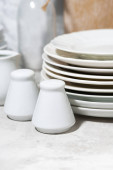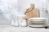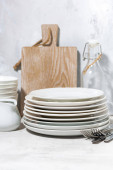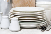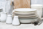 puste zastawy stołowe, sztućce i przybory kuchenne na białym tle, poziome