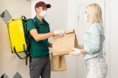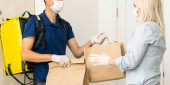 Coronavirus. Woman wearing a medical mask and rubber gloves receiving a package from a delivery man indoors. Virus prevention and protocols. Stay at home. Delivery service. Disinfecting the package.