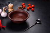 Smaczny makaron ryżowy z pomidorem, czerwoną papryką, grzybami i owocami morza na ciemnym, betonowym tle