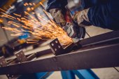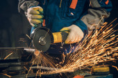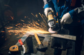 Ślusarz w specjalnych ubraniach i goglach pracuje w produkcji. Obróbka metali za pomocą szlifierki kątowej. Iskry w obróbce metali