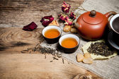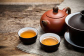 filiżanki z czajnik na starym drewnianym stole