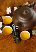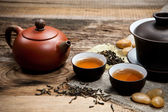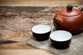filiżanki z czajnik na stole