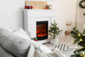 Ozdobiony kominek we wnętrzu pokoju w Wigilię Bożego Narodzenia